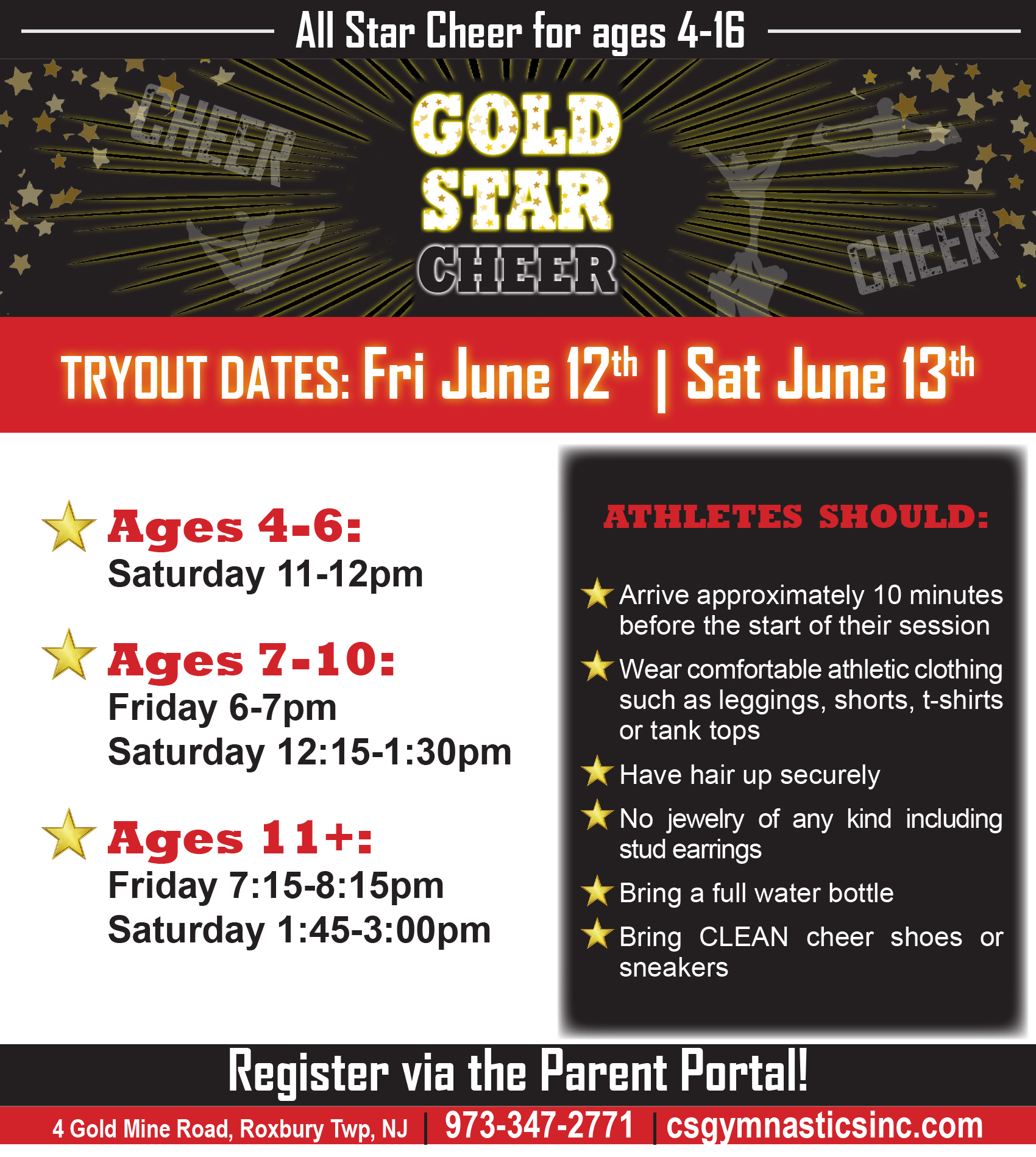 At CS, we believe that high level athletics can be achieved without burning athletes out! Keeping to this philosophy, and continuing our 42 year tradition of TRUSTED expertise, CS is so excited to launch Gold Star Cheer for the 2026-2027 Season!
