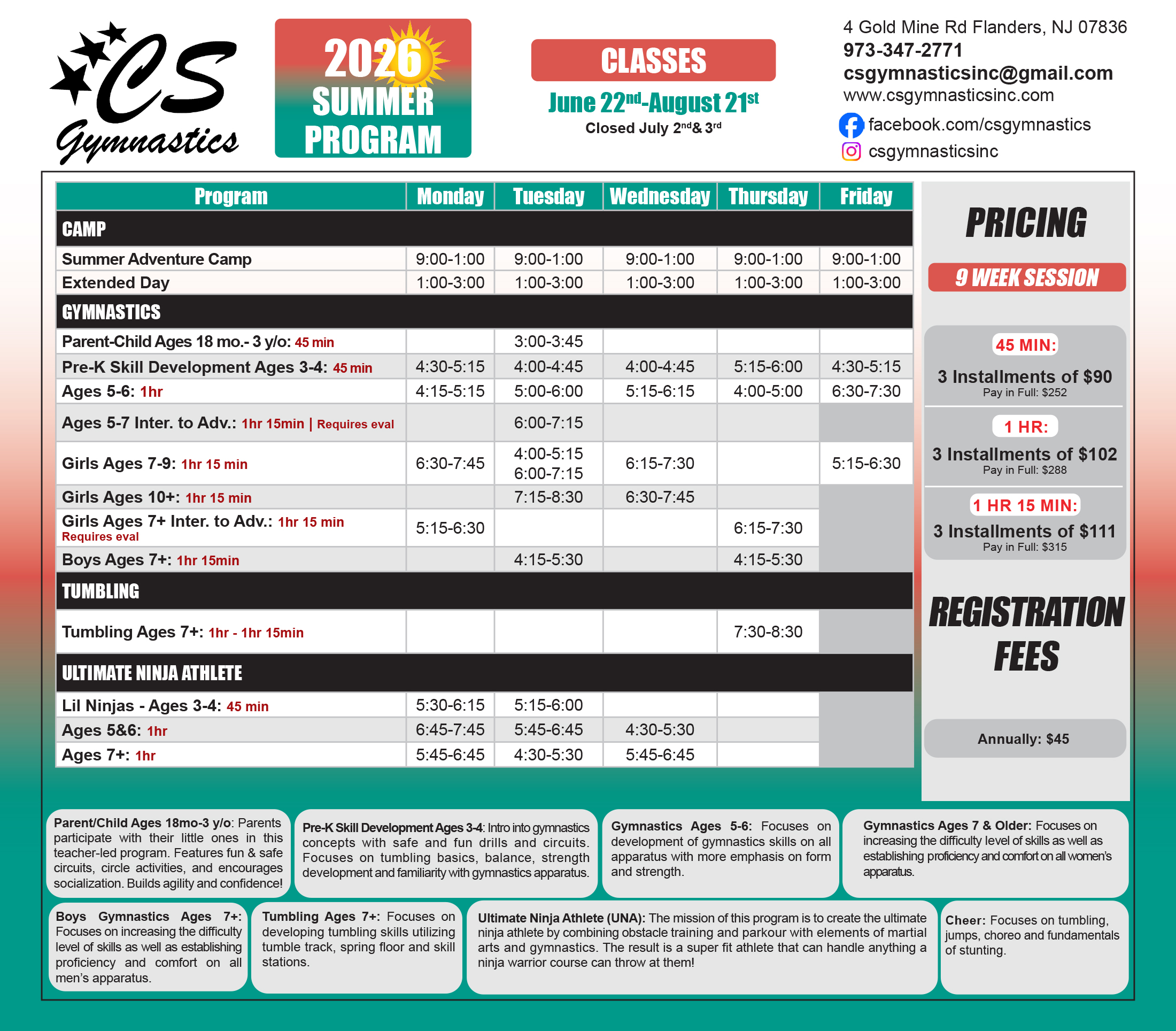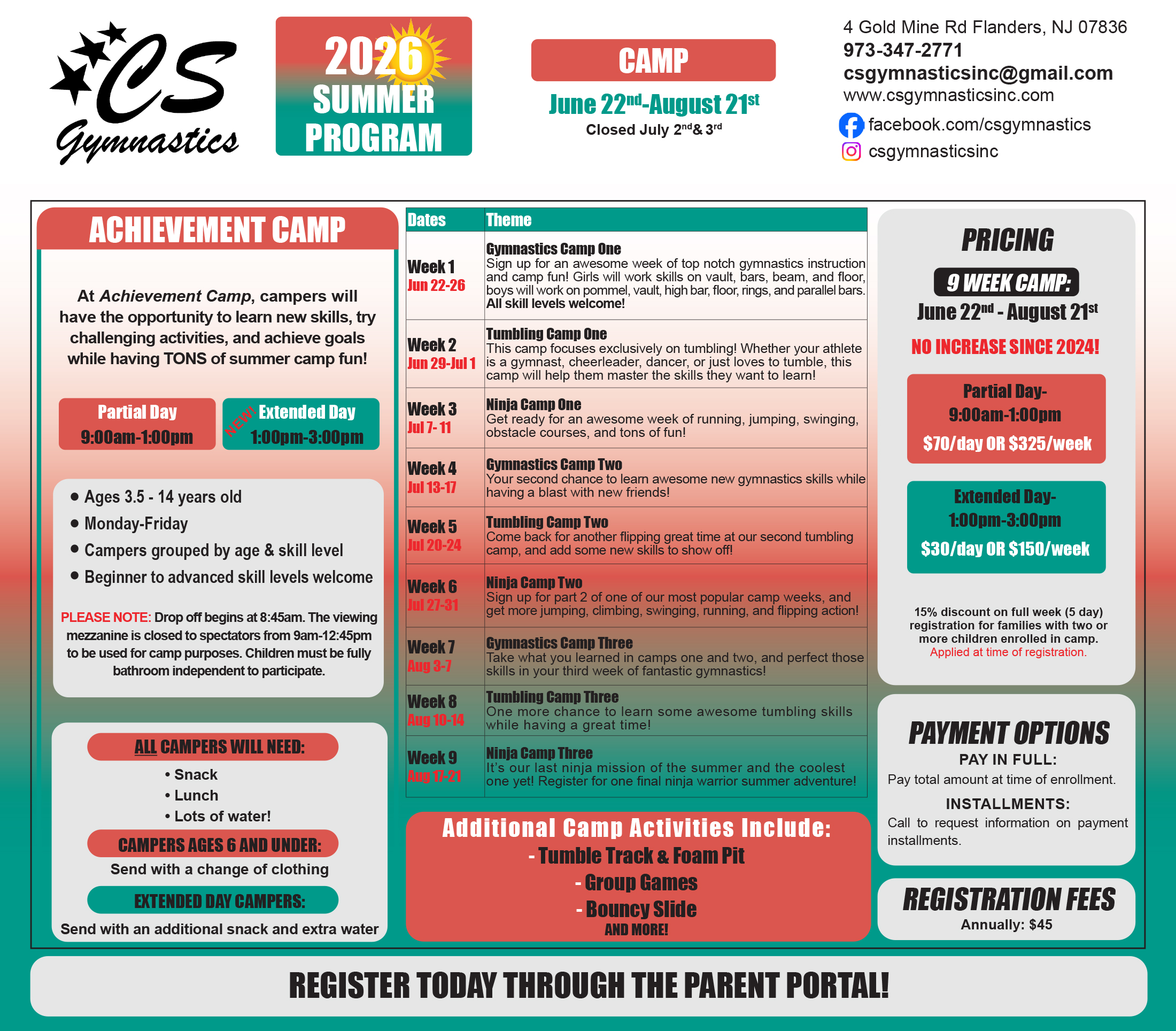 Please review the schedules below and register thru the Parent Portal to sign up!